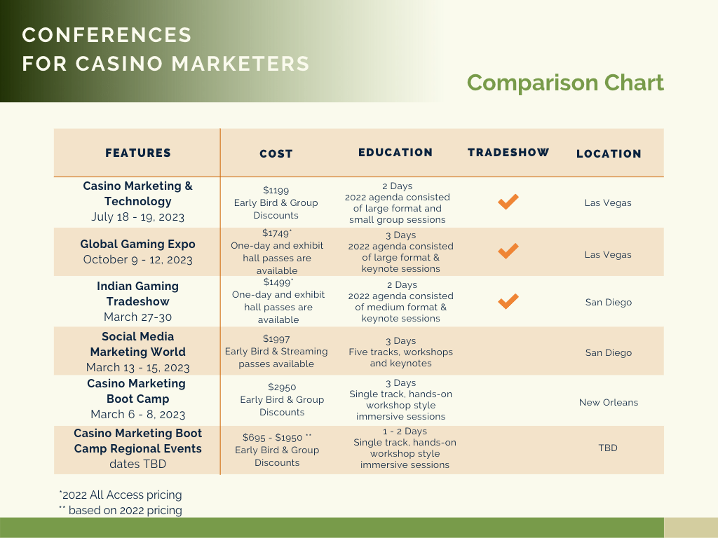 - Cost: Finally, think about your budget. Conferences can range in cost from a few hundred dollars to several thousand, so it’s important to choose one that fits within your budget. Make sure you’re aware of the conference fee before making your decision. Some conferences offer discounted rates for early bird registration or group discounts if you register with colleagues. You should also consider travel, hotel, and meals. We have provided a budgeting spreadsheet for those interested in attending Casino Marketing Boot Camp. It was a great idea we saw another conference using it!